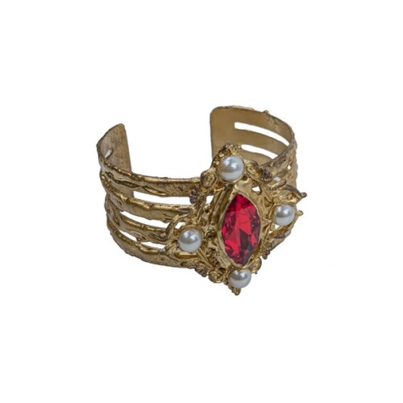 Стильний аксесуар, золотистий браслет з вензелем та червоним каменем, оздоблений перлинами.