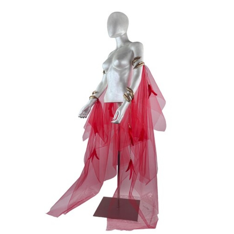 Ефектні прикраси на руки, що складаються з двох золотистих браслетів, декорованих стразовою стрічкою, червоним фатином та підвісками з пір'ям.