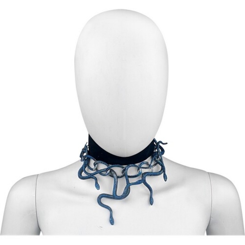 Карнавальний чокер-кольє на оксамитової стрічці, декорований золотисто-чорними зміями і ланцюжком, кріпиться за допомогою липучки. Цей карнавальний аксесуар - прекрасний вибір для доповнення карнавальних образів: Медуза Горгона, повелителька змій, королева монстрів, королева тьми, королева загробного світу, королева вампірів, на тематичну вечірку Хеллоуїн (Halloween).