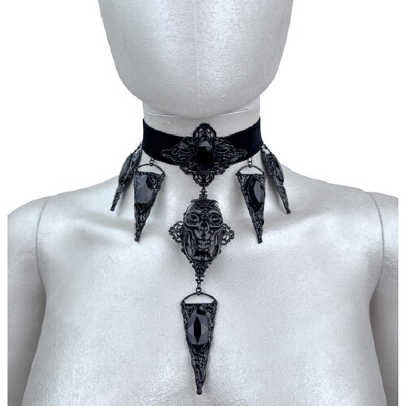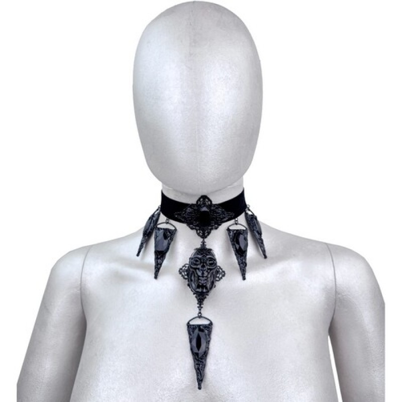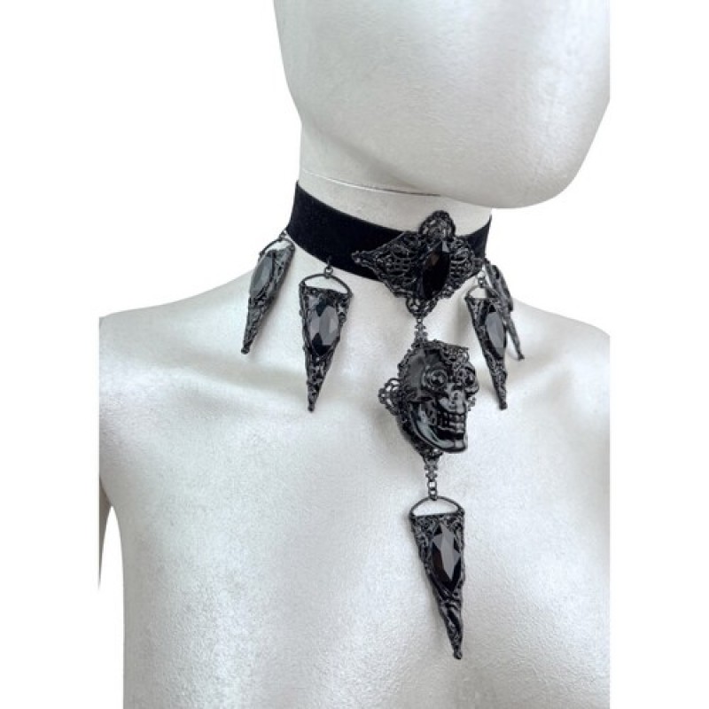 Стильний готичний чокер, декорований об'ємним черепом у мереживній металевій оправі та загостреними підвісками з чорним камінням, що нагадують кристали.