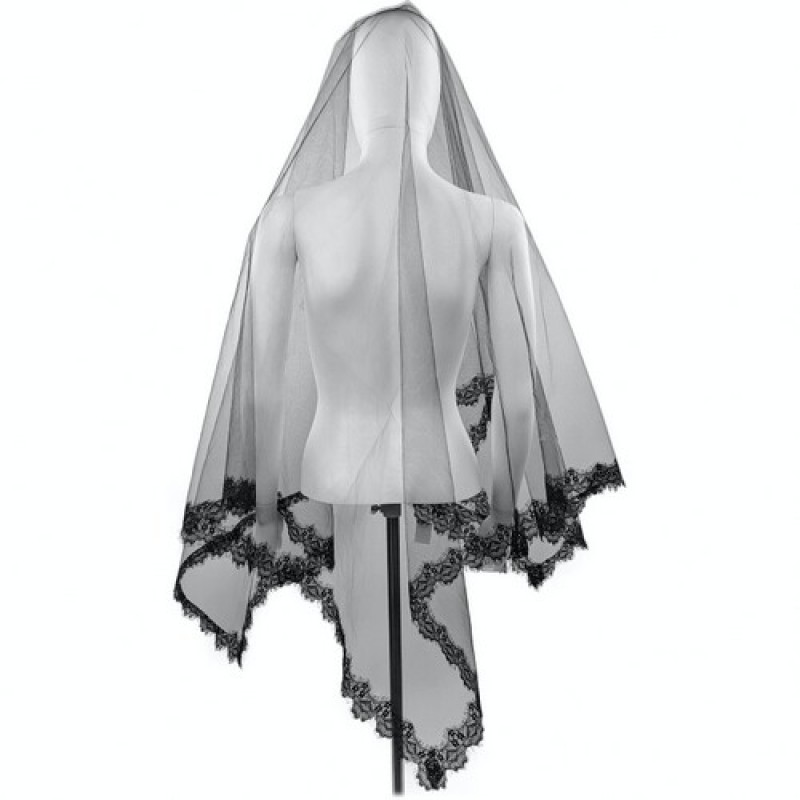 Чорна фата, декорована витонченим мереживом - відмінний вибір для фотосесії, готичної вечірки, прекрасне доповнення карнавальних образів: готична королева, чаклунка, відьма, королева тьми на Хеллоуїн (Halloween).