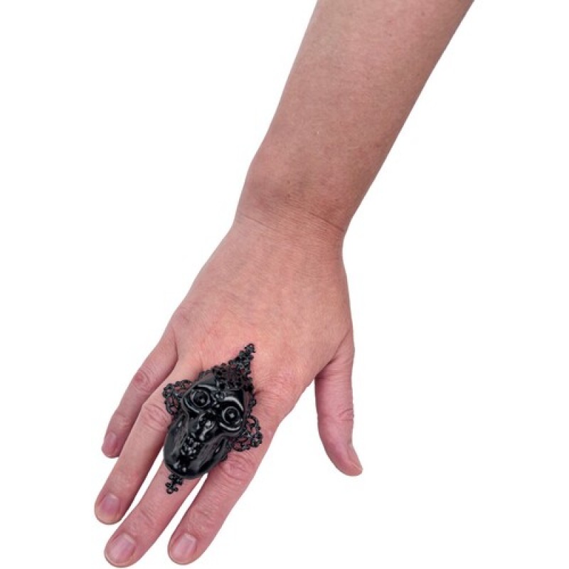 Ефектна каблучка з великим черепом, прикрашена вензелями та камінням.