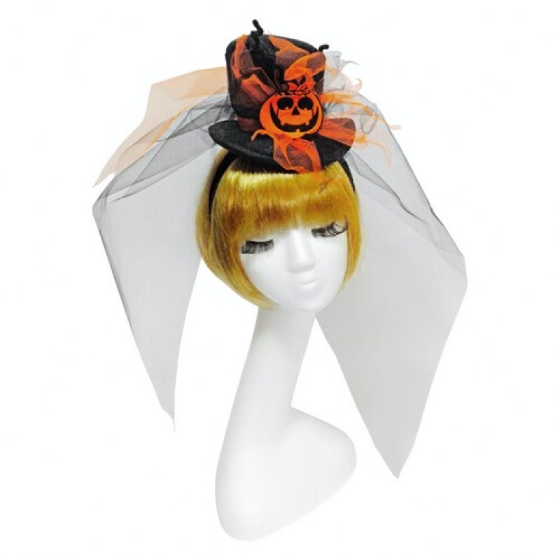 Маленький м'який циліндр з фатою на обручі на Хелловін (Halloween). Циліндр прикрашений яскравим усміхненим гарбузом.