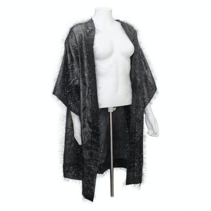 Яскрава широка накидка з блискучою ниткою люрексу. Плечі опущені.