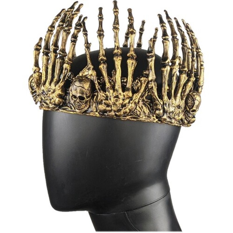 Карнавальна корона, декорована фігурками черепів та кистями рук, пофарбованих вручну в золотистий колір - відмінний вибір для доповнення карнавальних образів на Хелловін (Halloween).