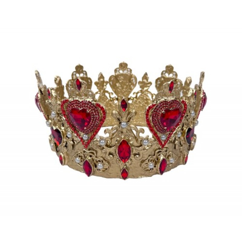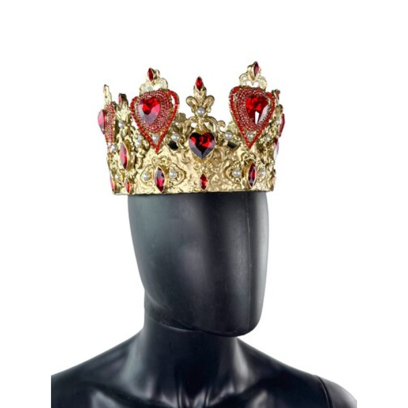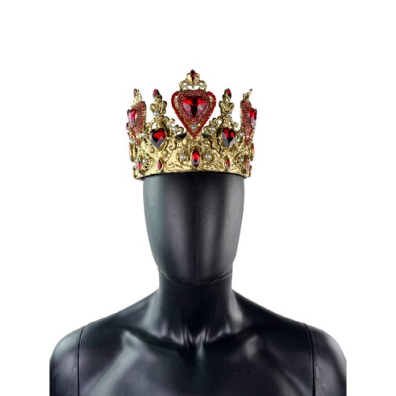Розкішна золотиста корона з витонченим королівським орнаментом, оздоблена червоним скляним камінням у формі сердець та дрібними перлинами.