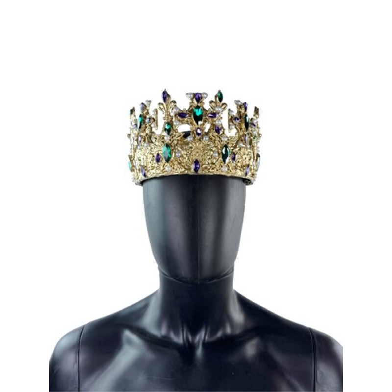 Розкішна золотиста корона, інструктована великими кольоровими каменями, фіолетового і смарагдового відтіннків, та ніжними перлинками.