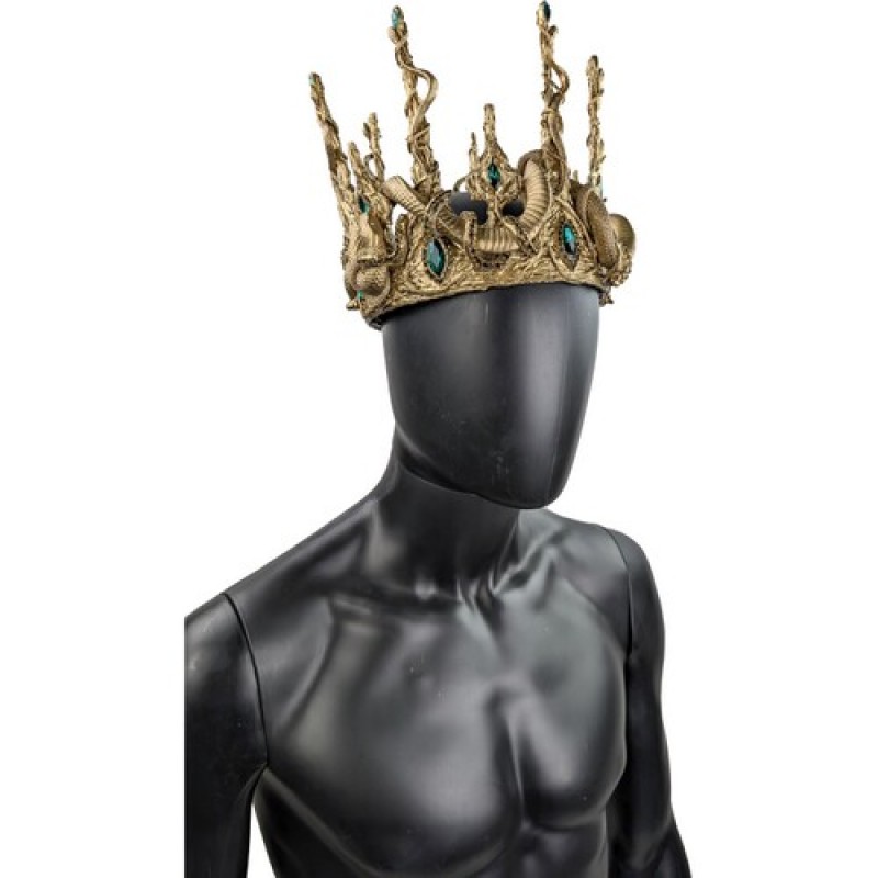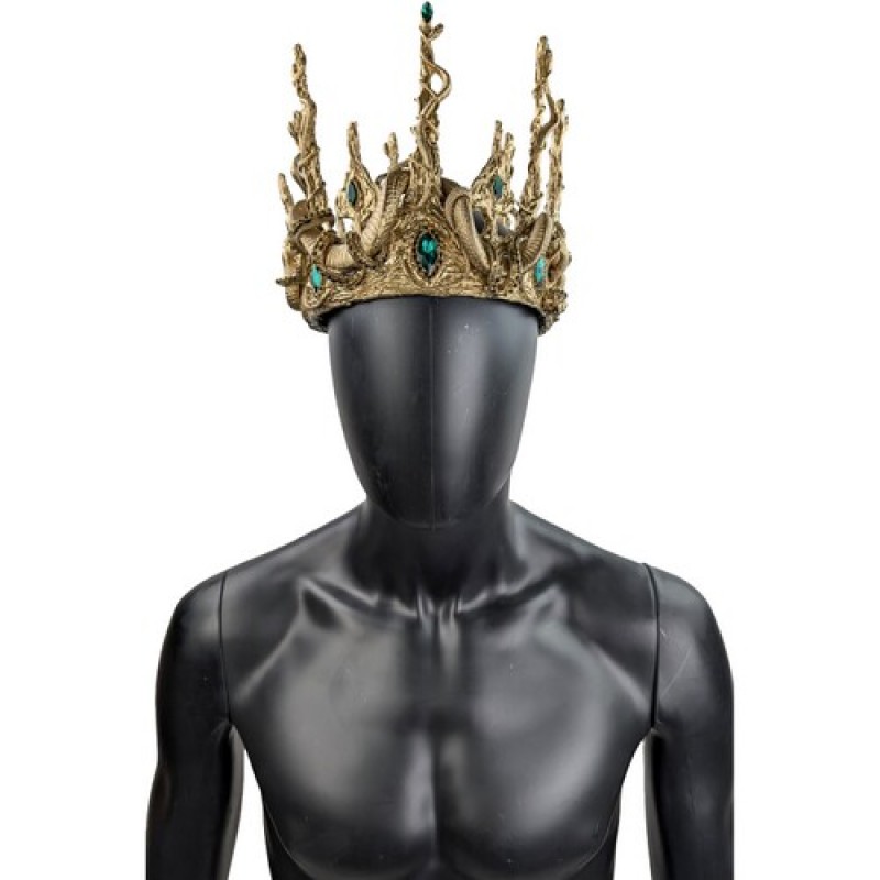 Неймовірна корона золотистого кольору, декорована великими та маленькими зміями, зеленим камінням та стразовою стрічкою.