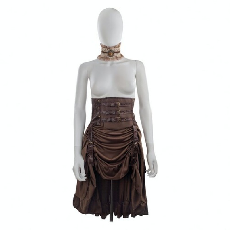 Костюм складається: оригінальна трикотажна коричнева спідниця, декорована воланами, штучною шкірою і фурнітурою бронзового кольору (20-865), біла сорочка з відкритими плечима, прикрашена ніжним мереживом (18-849wt), пояс-корсет (довжина регулюється), декорований штучною шкірою і фурнітурою (20-864) і витончений, вінтажний, карнавальний комір-чокер, виконаний з двох видів мережива (20-863BG). Цей костюм - прекрасний вибір для піратської вечірки, а також вечірки в стилі стимпанк.