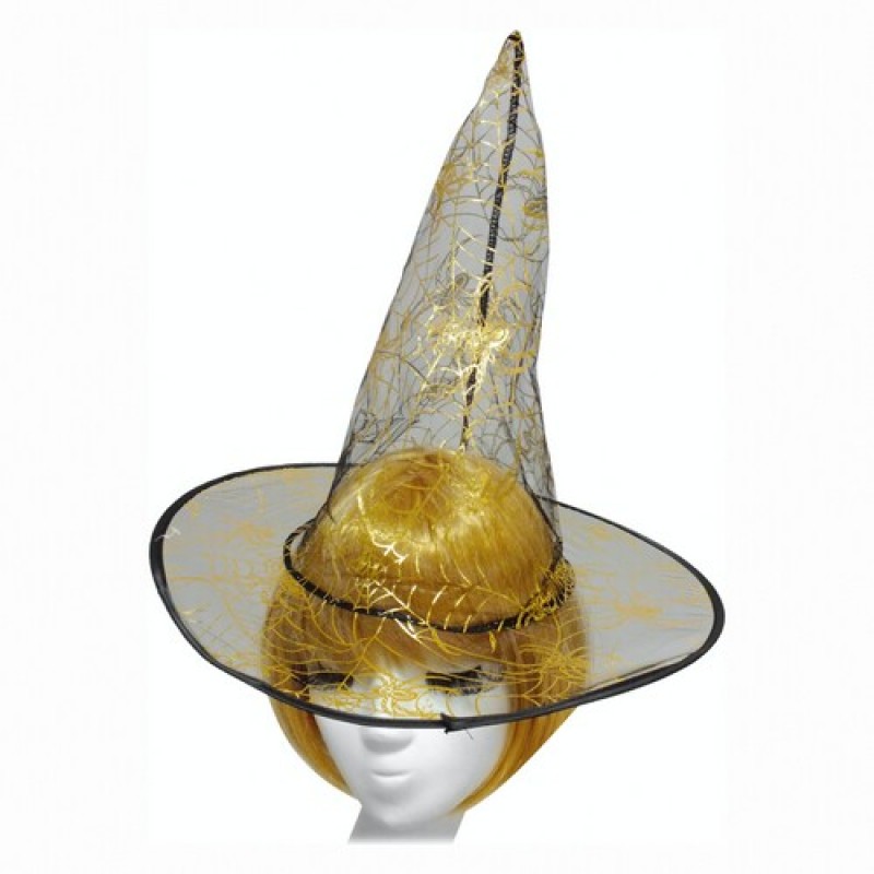 Напівпрозорий капелюх з золотистим малюнком у вигляді павутини з павуком.