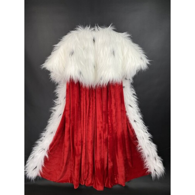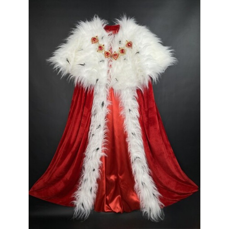Довгий королівський плащ із білим штучним хутром та червоною атласною підкладкою, декорований нагрудним кольє з масивними елементами у камінні в формі сердець.