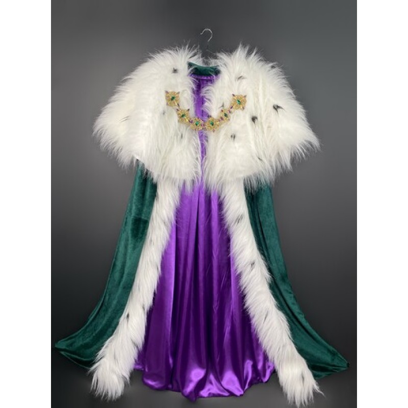Довгий королівський плащ із білим штучним хутром та фіолетовою атласною підкладкою, декорований нагрудним кольє з масивними елементами в різнокольоровому камінні.