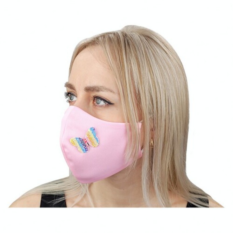 Захисна маска на обличчя, декорована блискучими різнобарвними метеликами.