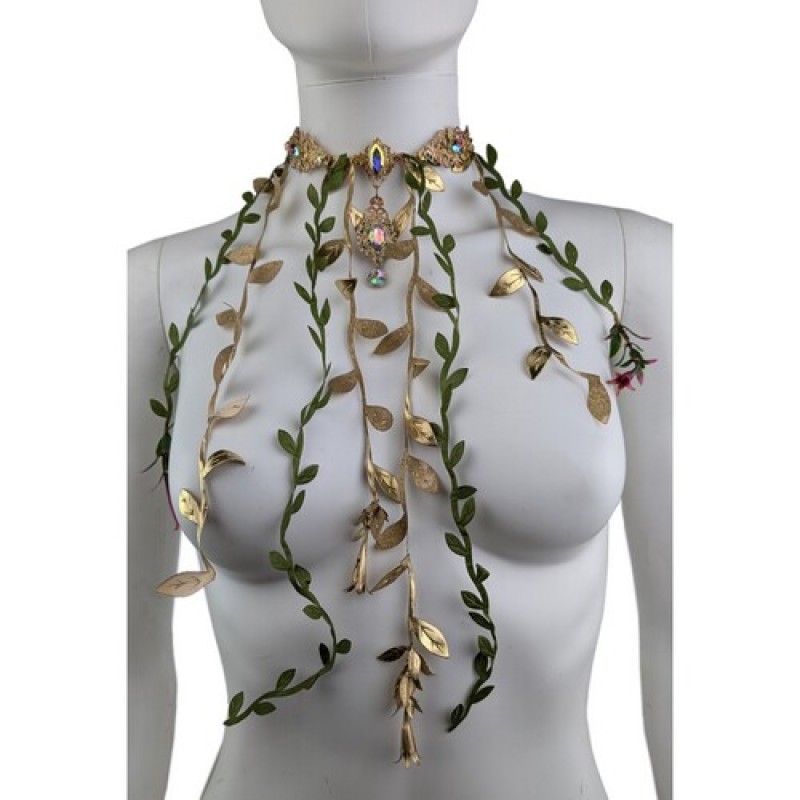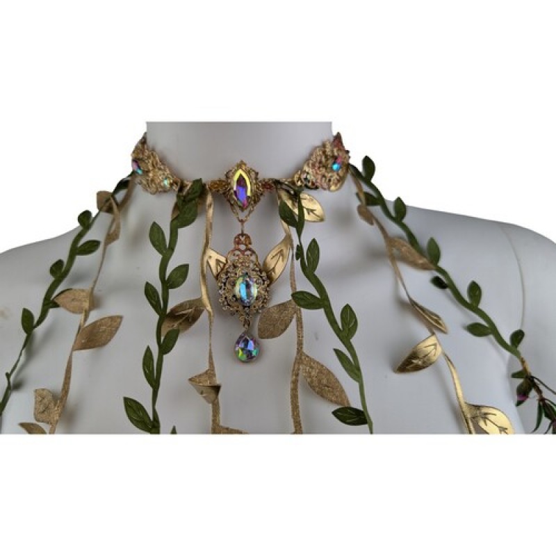 Оригінальне намисто, прикрашене блискучими золотистими вензелями, камінням та підвісками із стрічок з листочками.