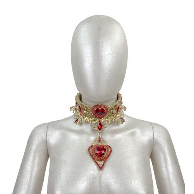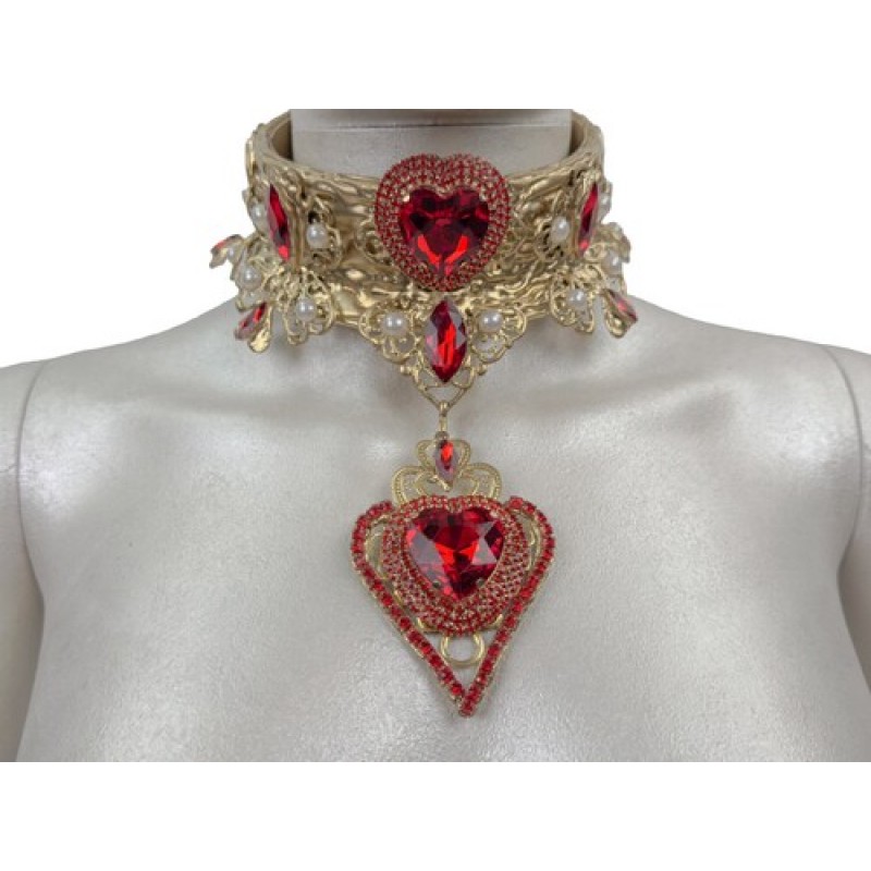 Вишукане намисто, оздоблене червоними кристалами у формі серця та ажурними металевими елементами.