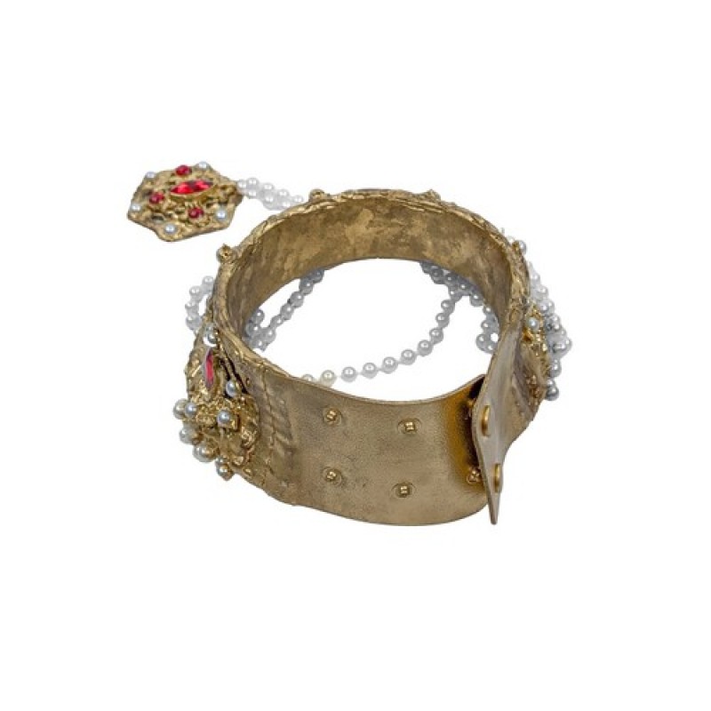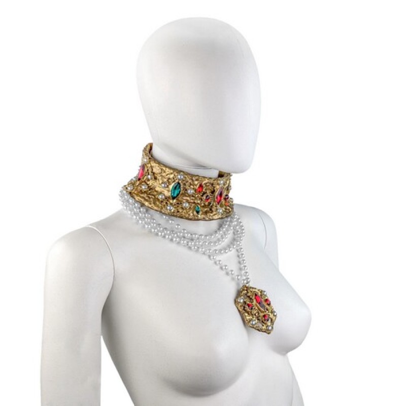 Вражаюче масивне намисто з підвіскою у формі шестикутника, оздоблене червоним та смарагдовим камінням і ніжними перлинками, що додають вишуканості та розкоші.
