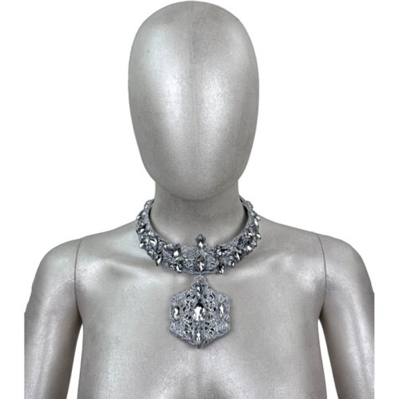 Вишукане сріблясте намисто-чокер з центральним підвісом, оздоблене прозорим блискучими камінням.