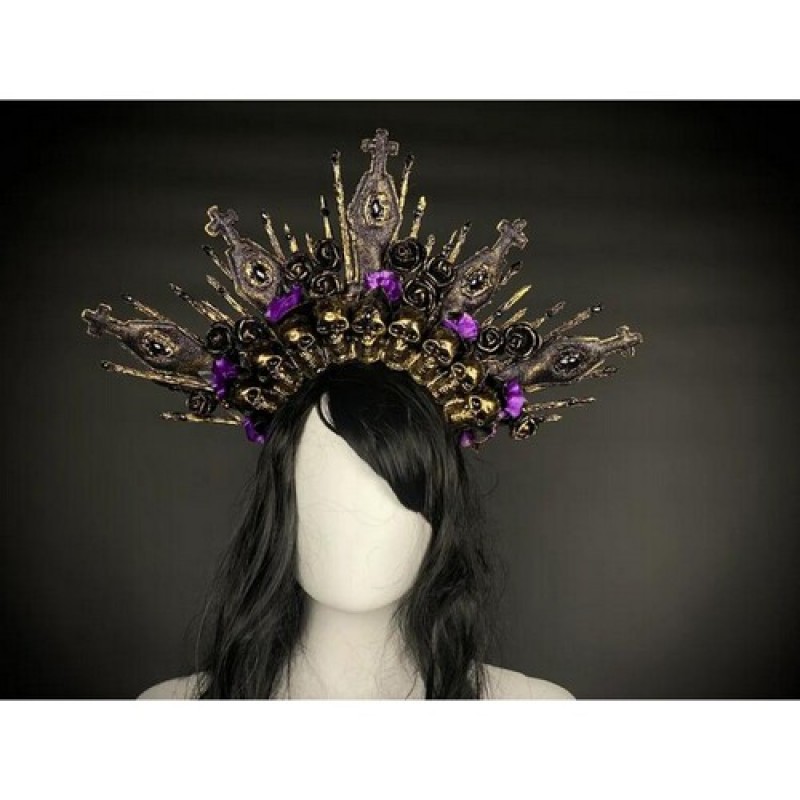 Оригінальний головний убір, декорований чорно-фіолетовими трояндами, пластиковими черепами 5см, пластиковими променями, хрестами shine.