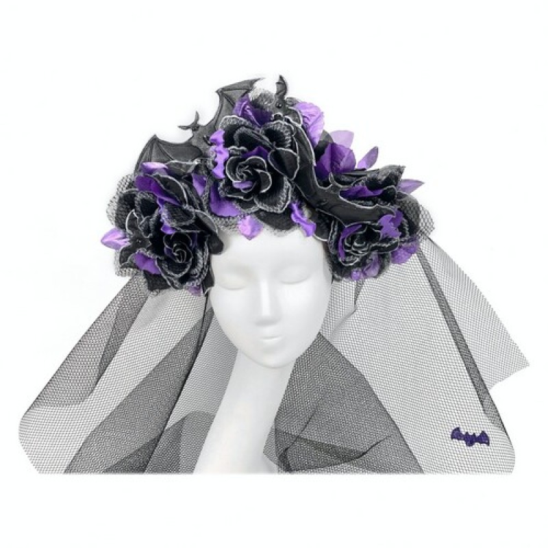 Оригінальний обруч, прикрашений кажанами, чорно-фіолетовими трояндами, сіткою і фатою. Цей головний убір - відмінне доповнення для карнавальних образів королева кажанів, королева монстрів, королева тьми, королева загробного світу, на тематичну вечірку Хеллоуїн (Halloween).