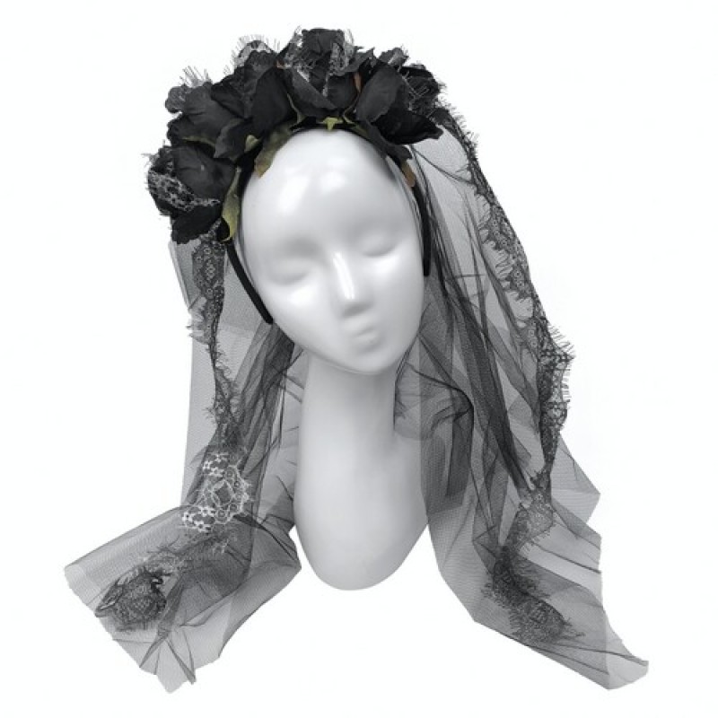 Оригінальний обруч, декорований чорними трояндами, мереживом і фатою. Підійде для карнавального образу на тематичну вечірку, Хелловін (Halloween).