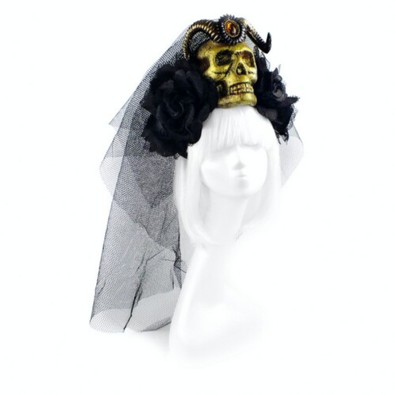 Обруч безрозмірний, прикрашений золотистим черепом, рогами, квітами і фатою. Підійде для загадкового демонічного образу Санта Муерте (Санта Муерте, Santa Muerte) на костюмовану вечірку, Хеллоуїн.