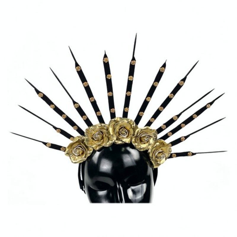 Оригінальний обруч, декорований чорними променями і золотими трояндами, підійде для карнавального образу на тематичну вечірку Санта Муерте (Santa Muerte), Хелловін (Halloween).