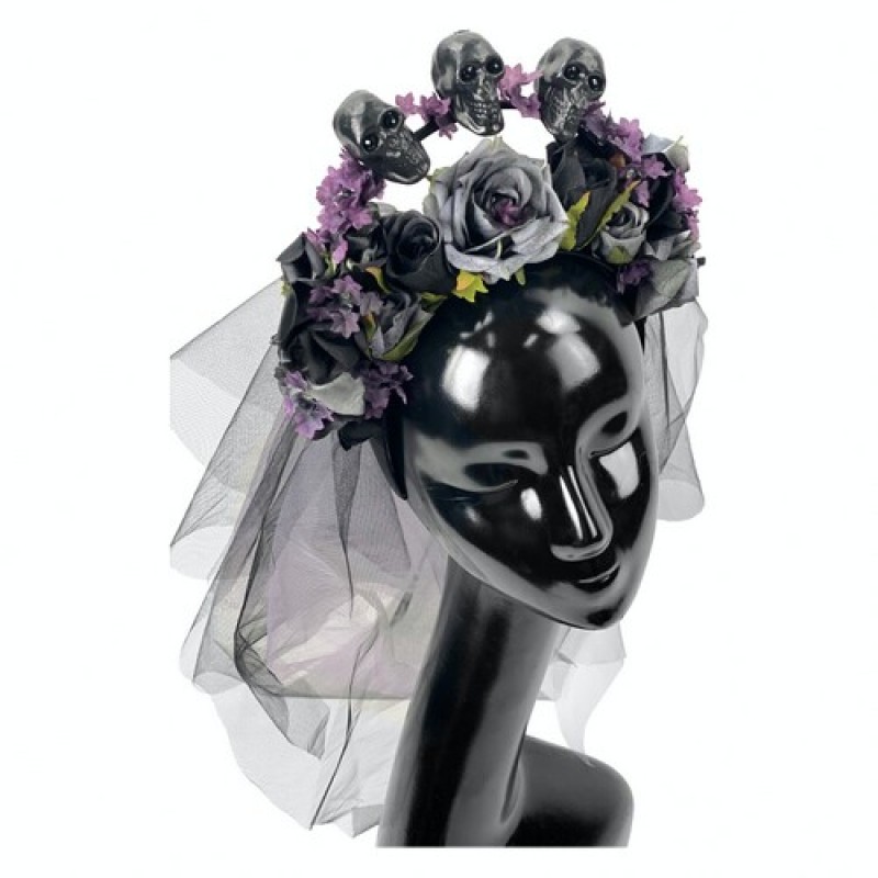 Оригінальний обруч, декорований чорними черепами, квітами і фатою. Підійде для карнавального образу на тематичну вечірку, Хелловін (Halloween).