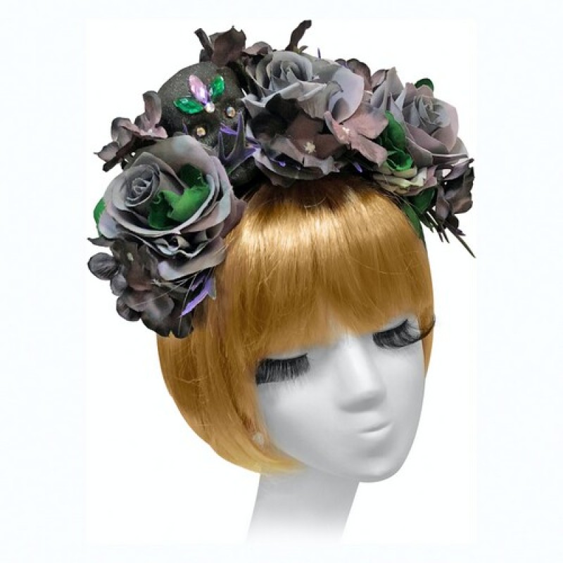 Обруч з сірими трояндами з посадженим всередині черепом підійде Вам для карнавального образу Санта Муерте (Santa Muerte) на костюмовану вечірку, Хелловін.