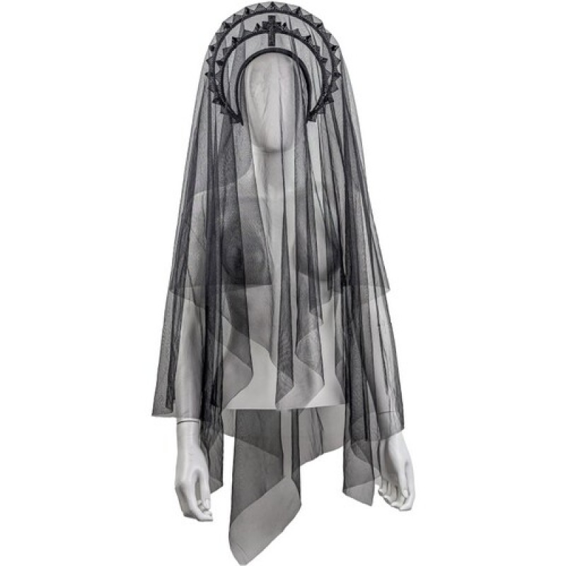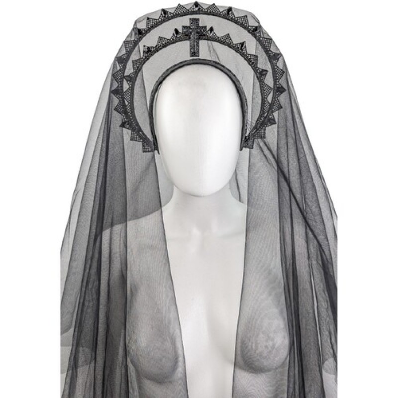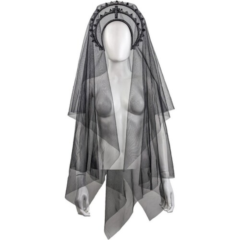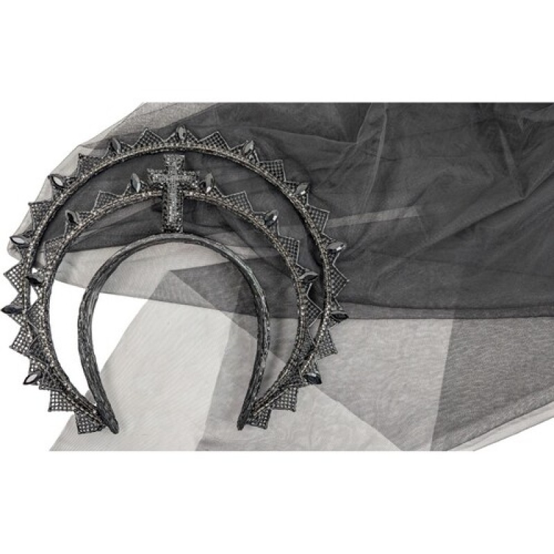 Ефектний головний убір у готичному стилі, декорований хрестом в камінні у центрі виробу, симетричними елементами, що нагадують шипи та легким прозорим фатином.