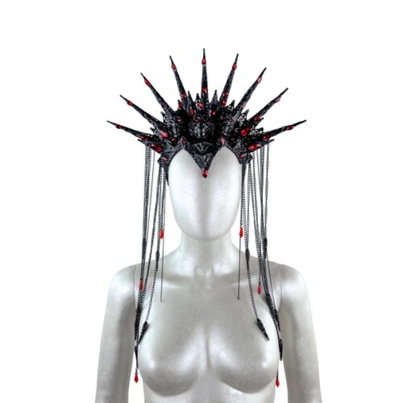 Розкішний головний убір в готичному стилі, декорований великими шипами, чорними черепами, червоним камінням та підвісками з ланцюжків із загостренням на кінцівках, що додають містичної сили та величності.