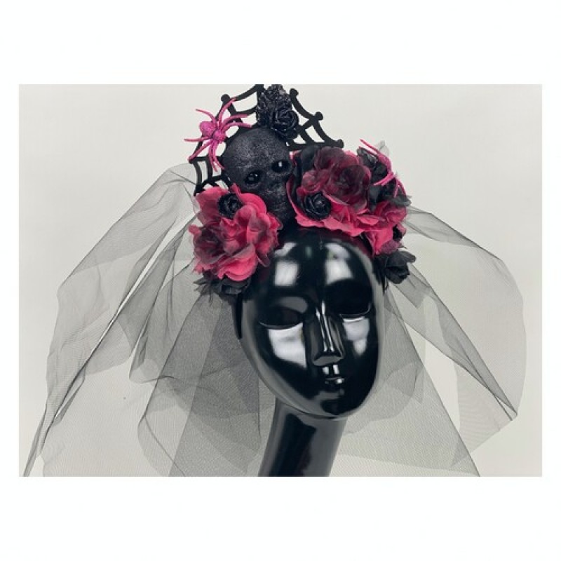 Довжина фати до 55 см. Обруч із фатою, декорований чорним черепом shine, двома малиновими павучками shine, фетровим павутинням, чорними блискучими трояндами, а також трояндами чорного та малинового кольорів. Оригінальний аксесуар для карнавального образу на тематичну вечірку Хелловін (Halloween).