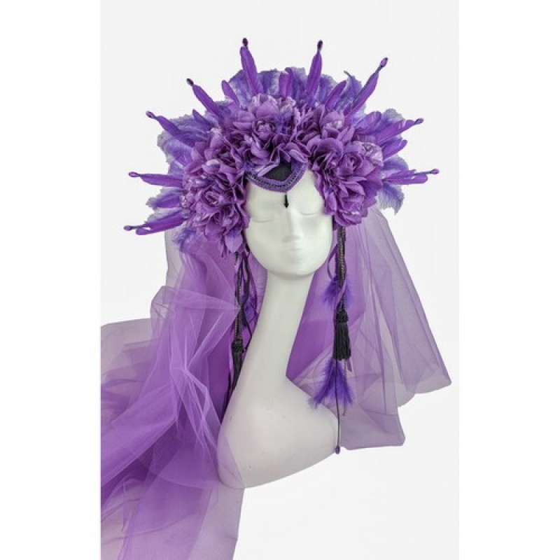 Чудовий головний убір, декорований квітами, пір'ям, штучним камінням, променями і фатою - відмінний вибір для фотосесій, тематичних вечірок, шоу програм, карнавалу Марді Гра, на тематичну вечірку Санта Муерте (Santa Muerte), Хеллоуїн (Halloween).