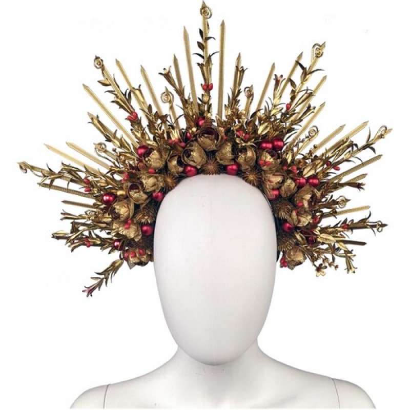 Оригінальний аксесуар у вигляді обруча, декорованого пластиковими золотистими променями, золотистими трояндочками, декоративною тасьмою у вигляді листочків та червоними ягідками. Цей головний убір - чудовий вибір для фотосесії, вечірки, доповнення карнавального образу богині, феї, казкової королеви. Розмір універсальний додатково фіксується за допомогою резинки.