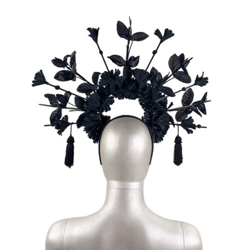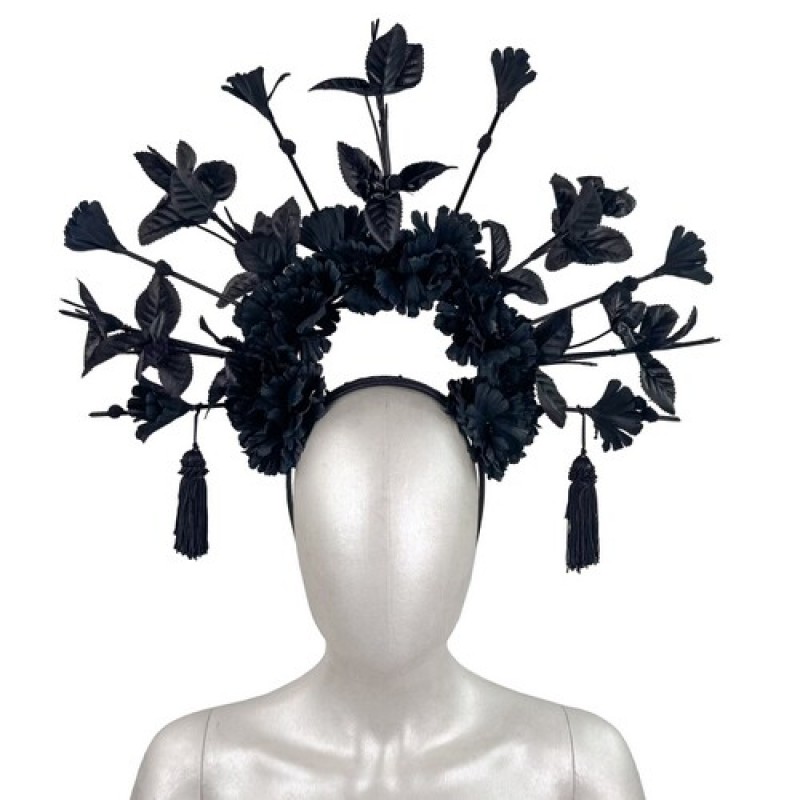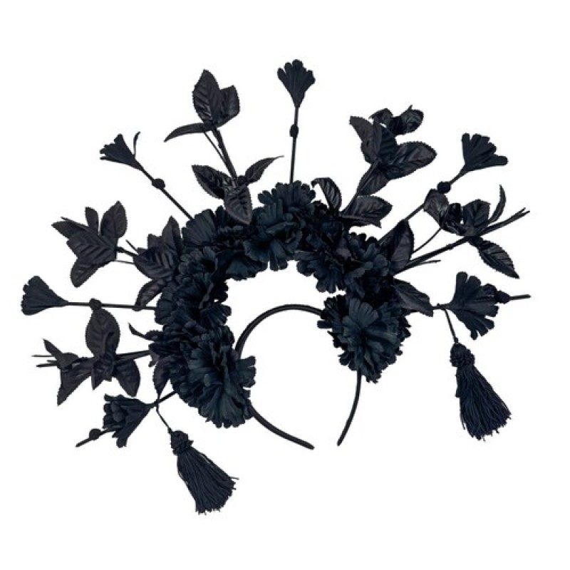 Оригінальний, незвичайний обруч, декорований чорними квітами, гілками, фігуркою пташки і листям для карнавального образу на тематичну вечірку Санта Муерте (Santa Muerte), Хелловін (Halloween).