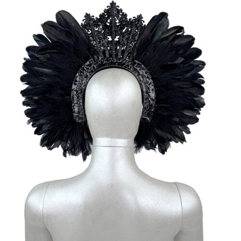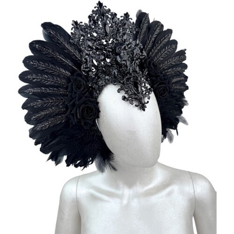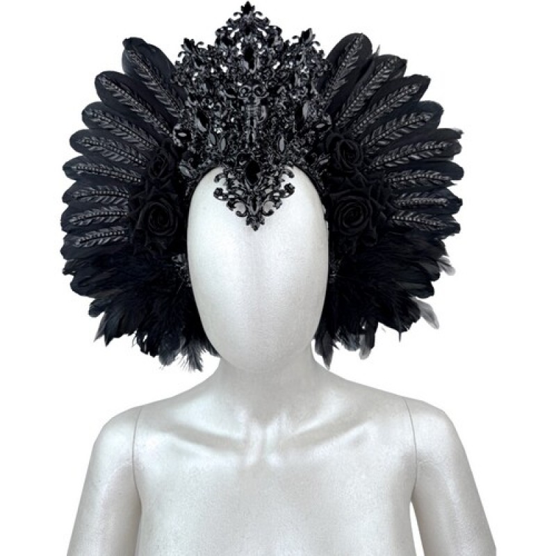 Розкішний обруч ручної роботи, прикрашений пір'ям, чорними трояндами, блискучим камінням та об'ємними візерунками з черепами, які надають образу містичності та загадковості.