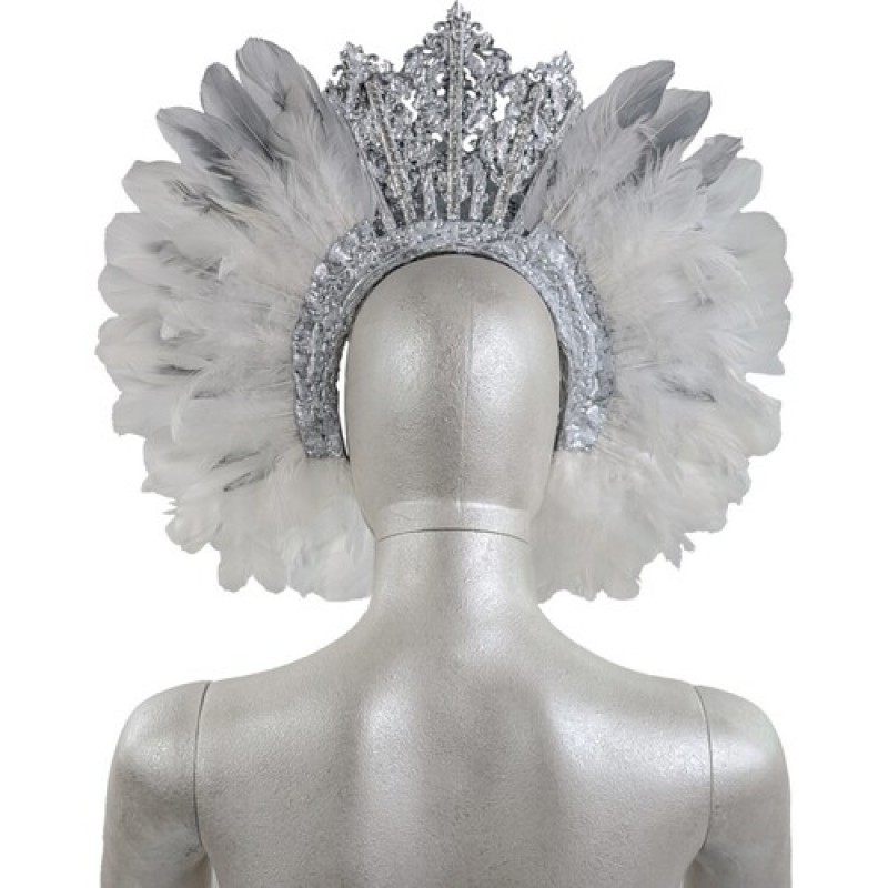 Розкішний обруч ручної роботи, прикрашений пір'ям, білими трояндами, блискучим камінням та об'ємними срібними візерунками з черепами, які надають образу містичності та загадковості.