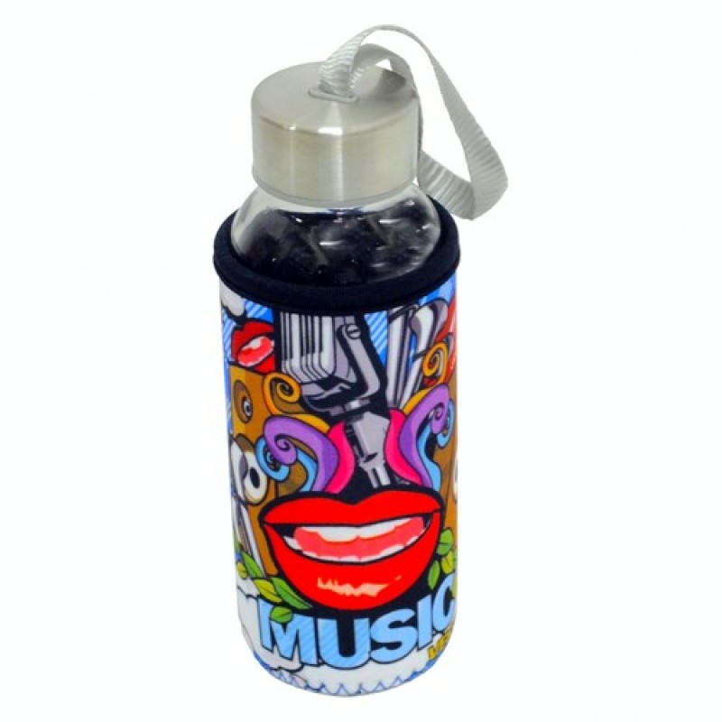 Спортивна пляшечка (бутилочка) для води або іншого напою. Скляна пляшка в термочохлі. На кришечці є ручка-петля.