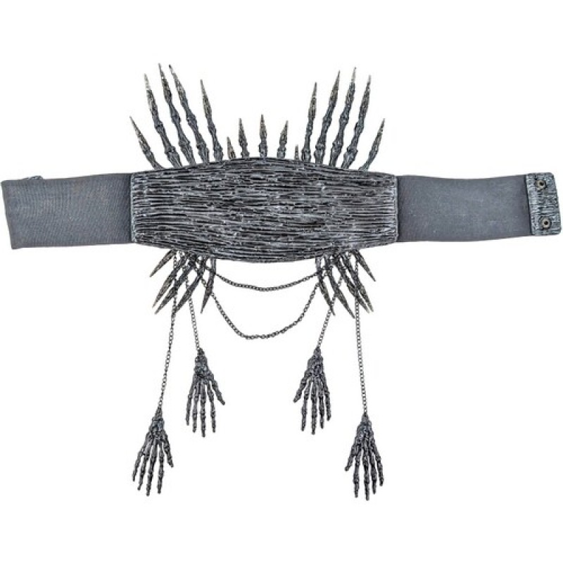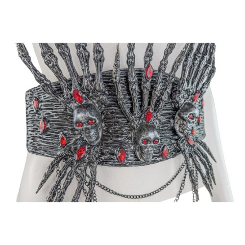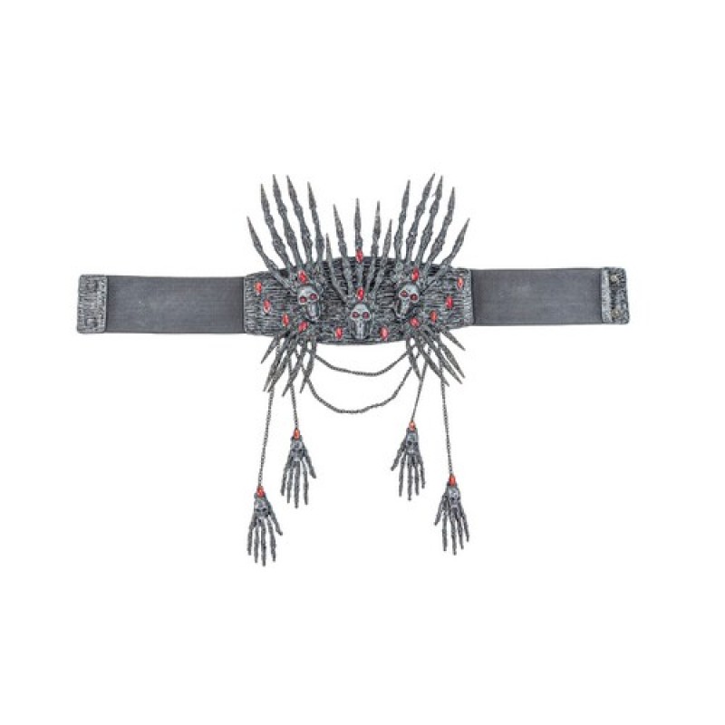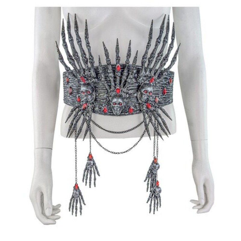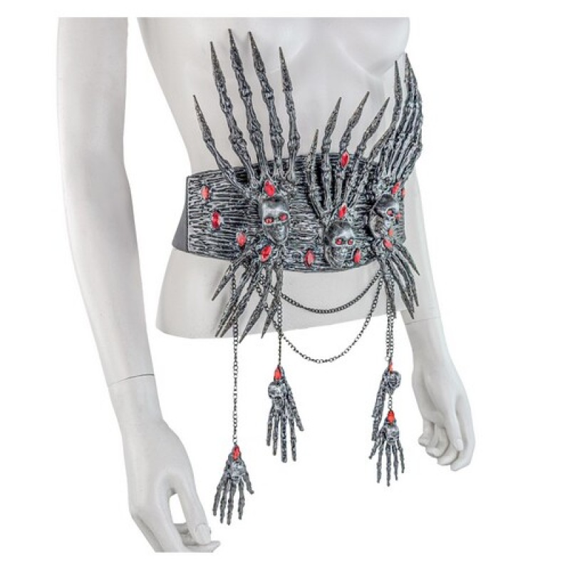 Пояс - корсет декорований кистями рук, черепами та червоним камінням.
