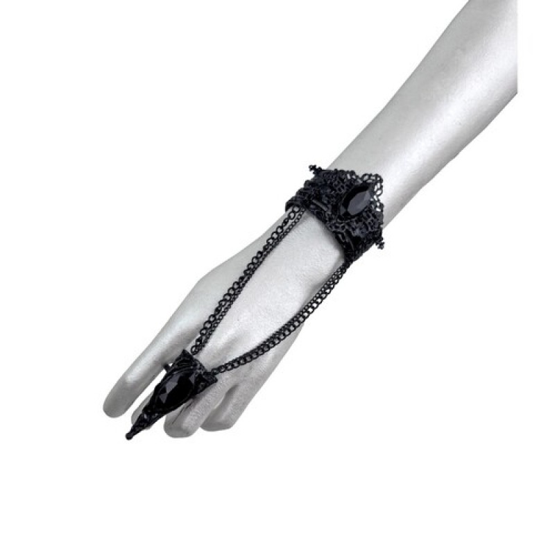 Стильний аксесуар у готичному стилі, слейв-браслет з рельєфними вензелями та масивним каменем у центрі, з'єднаний ланцюжками з кільцем, декорований загостреною фігурою з каменем.