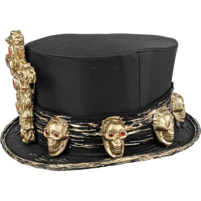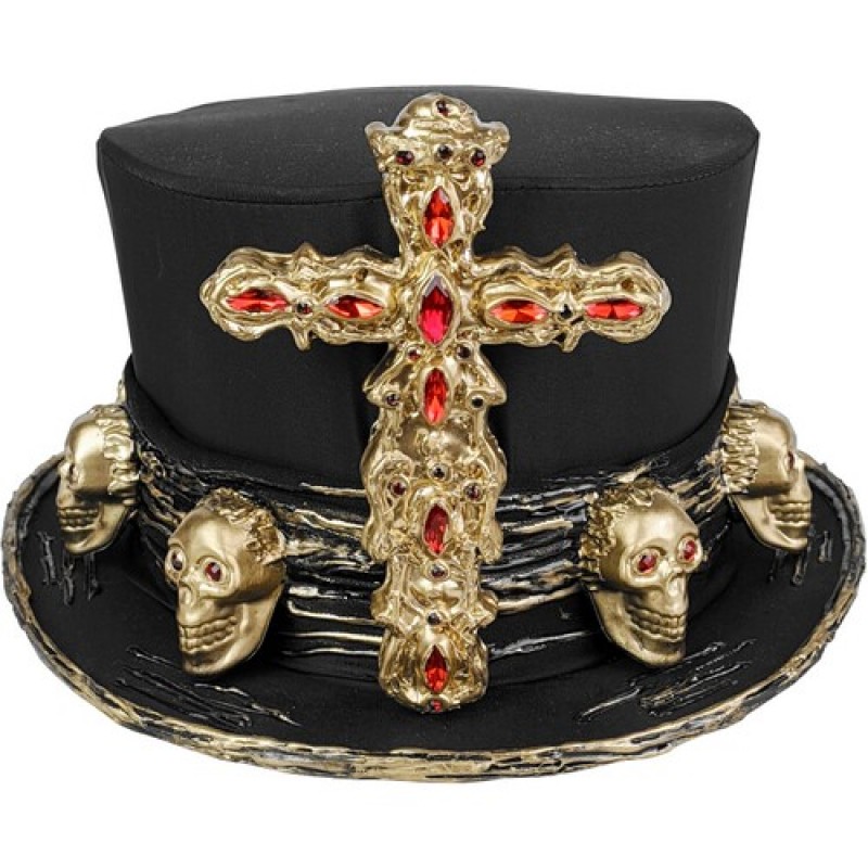 Классический чёрный цилиндр с широкими полями. Цилиндр - трансформер декорирован золотистыми черепами и крестом (сьемным), складывается и превращается в плоский.