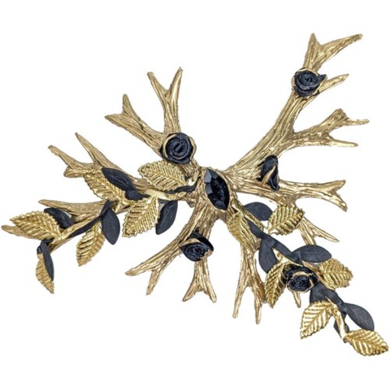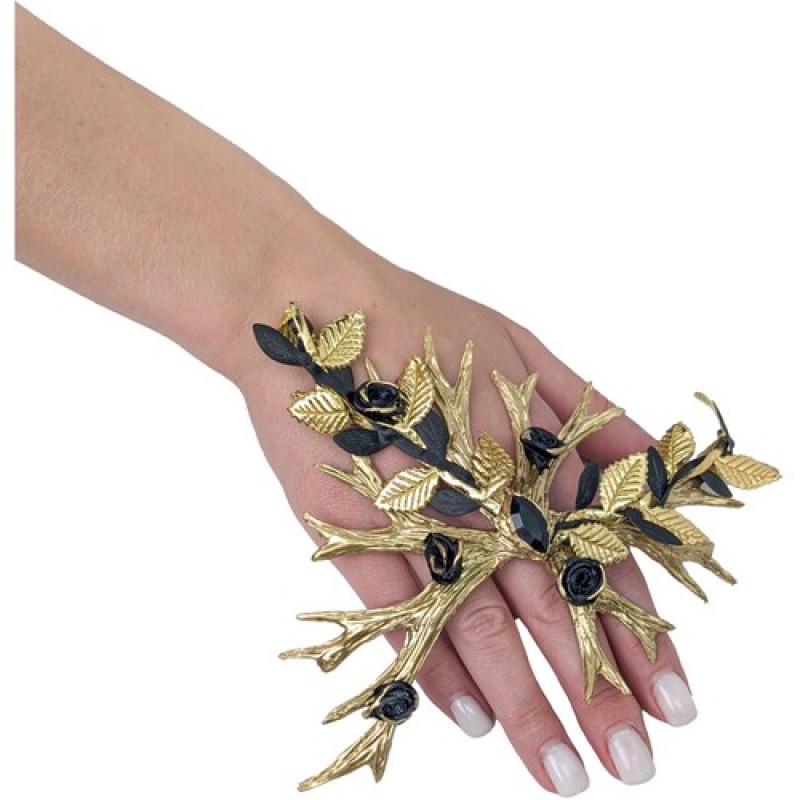 Оригинальное кольцо в форме золотистых веток, декорированных черными розочками и листочками.