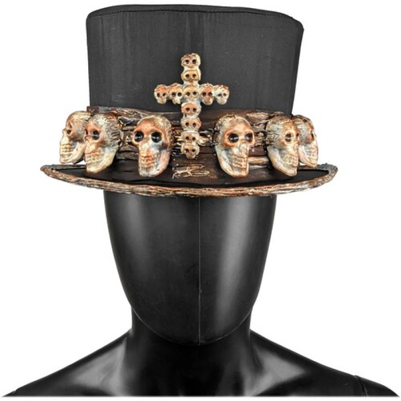 Шляпа декорирована черепами и крестом по средине, идеальное дополнение для карнавального образа.