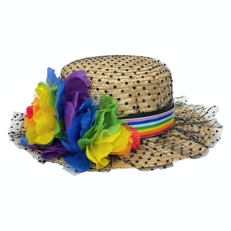 Стильная шляпа из натуральной соломки , покрытая фатином в горошек, украшенная символикой ЛГБТ сообщества - радужной лентой и цветами, как символом борьбы за права сексуальных меншинств и поддержки представителей нетрадиционной ориентации как полноправных членов общества.