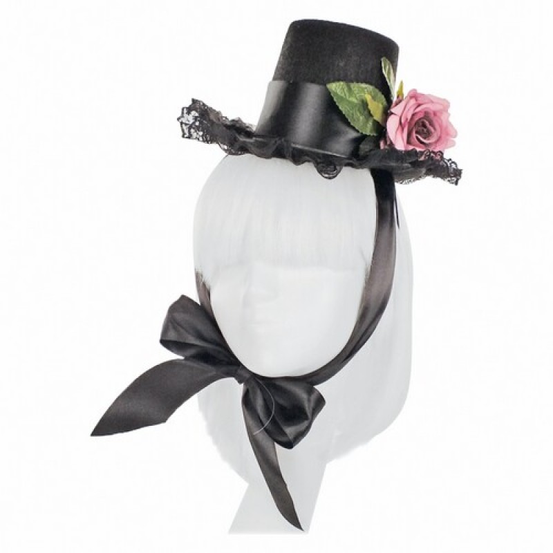Эффектная шляпа черного цвета, декорированная кружевом и розой, фиксируется с помощью атласных лент. Данный аксессуар поможет создать неповторимый карнавальный образ на вечеринку в стиле аниме, японскую вечеринку.