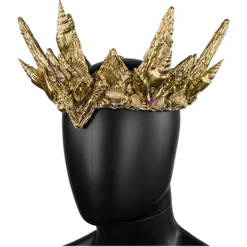 Невероятная корона золотистого цвета, декорирована ракушками, камнями хамелеон и жечугом.