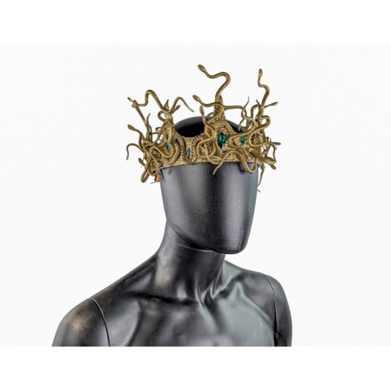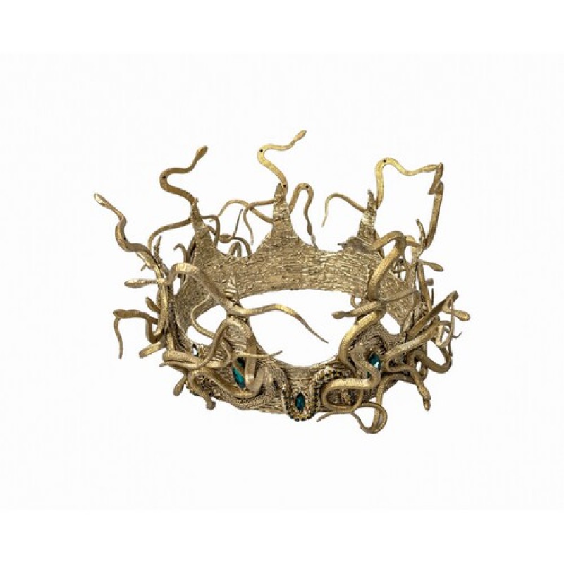 Невероятная корона золотистого цвета, декорирована извивающимися маленькими змеями, изумрудными камнями и стразовой лентой.