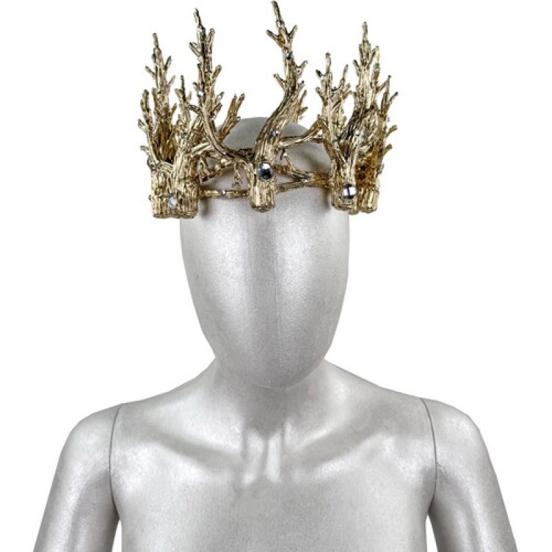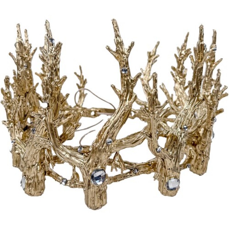 Оригинальная корона золотистого цвета декорирована ветвями и камнями.