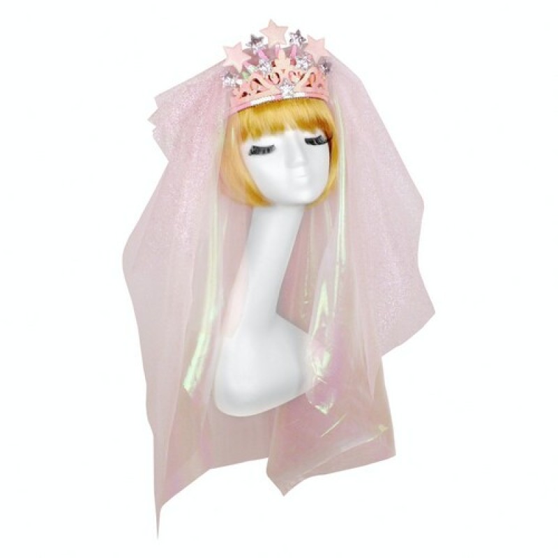 Коронка украшена блестящими звёздами и дополнена фатой. Одевается с помощью резинки. Этот головной убор станет отличным аксессуаром принцессы или королевы на Новый год.