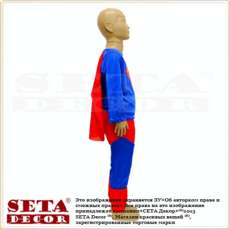 Карнавальный костюм Супермена для ребёнка (мальчика). Костюм стрейчевый. Брюки на резинке. Плащ - 41 х 39 см, маска -19 х 9 см.