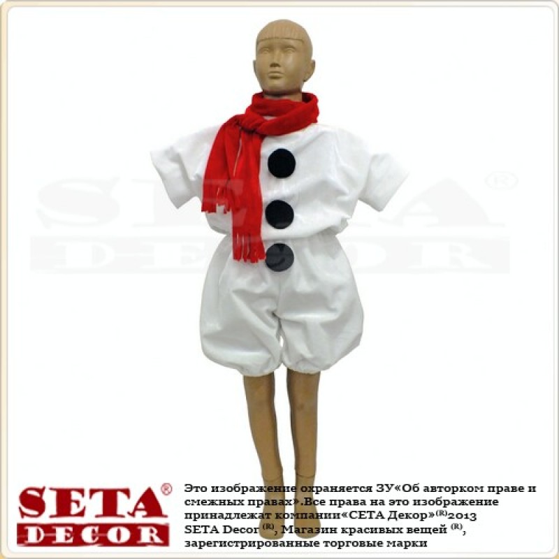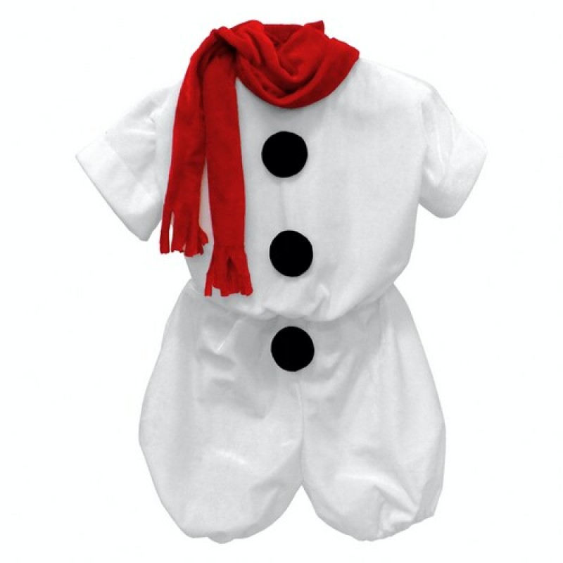 Карнавальный детский костюм снеговика с тремя большими мягкими пуговицами и красным шарфиком.